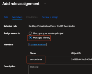 After deployment, the Automation Account’s managed identity must be granted the Desktop Virtualization Power On Off Contributor role on the subscription or resource groups where VM power management should be applied.