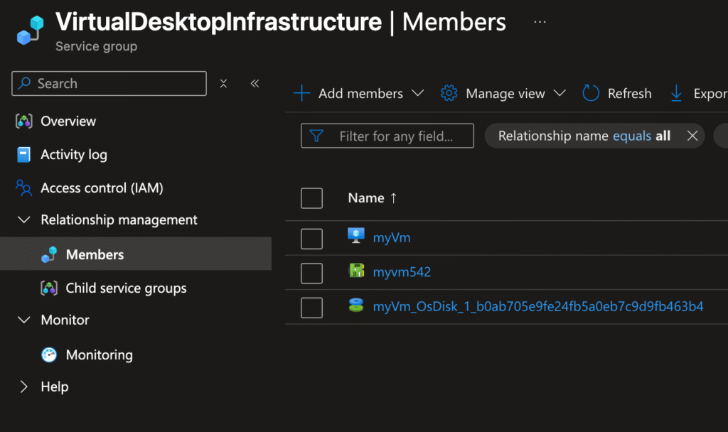 - On the resources you want to add Membership is managed via the resource relationship type Microsoft.Relationships/serviceGroupMember.
